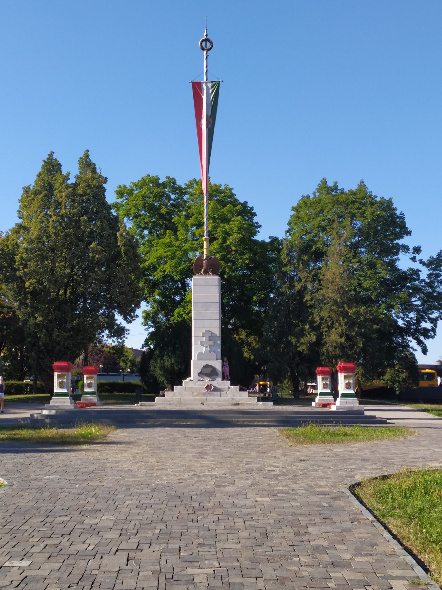 Zu unserer unbändigen Freude gab es schon wieder so ein 5 Forint Drehteil und wie schon in Budapest scheiterte es am 5 Forint Stück. Aber das Teil stand vor einem Fotoladen und der Inhaber des Ladens schien auch der Inhaber des Drehteils zu sein. Axel ist in den Laden und kam mit dem passenden Kleingeld raus. Herrliche Welt. Wir setzten uns eine Weile auf den Markt, sahen dem Wasserspiel zu, genossen den Tag und guckten bissel Leute. Da es auf dem Markt auch ein Lebensmittelgeschäft gab, kauften wir fix das benötigte Brot, nebenan noch ein Bier und besuchten dann noch das einzige Minarett der Stadt. Das hat eine Besonderheit, es ist ein Kreuz oben drauf. Auf dem Rückweg zum Campingplatz machten wir noch einen Abstecher in einem Park - Bank fürs Bier gesucht und gefunden und gemütlich eine Weile gesessen.